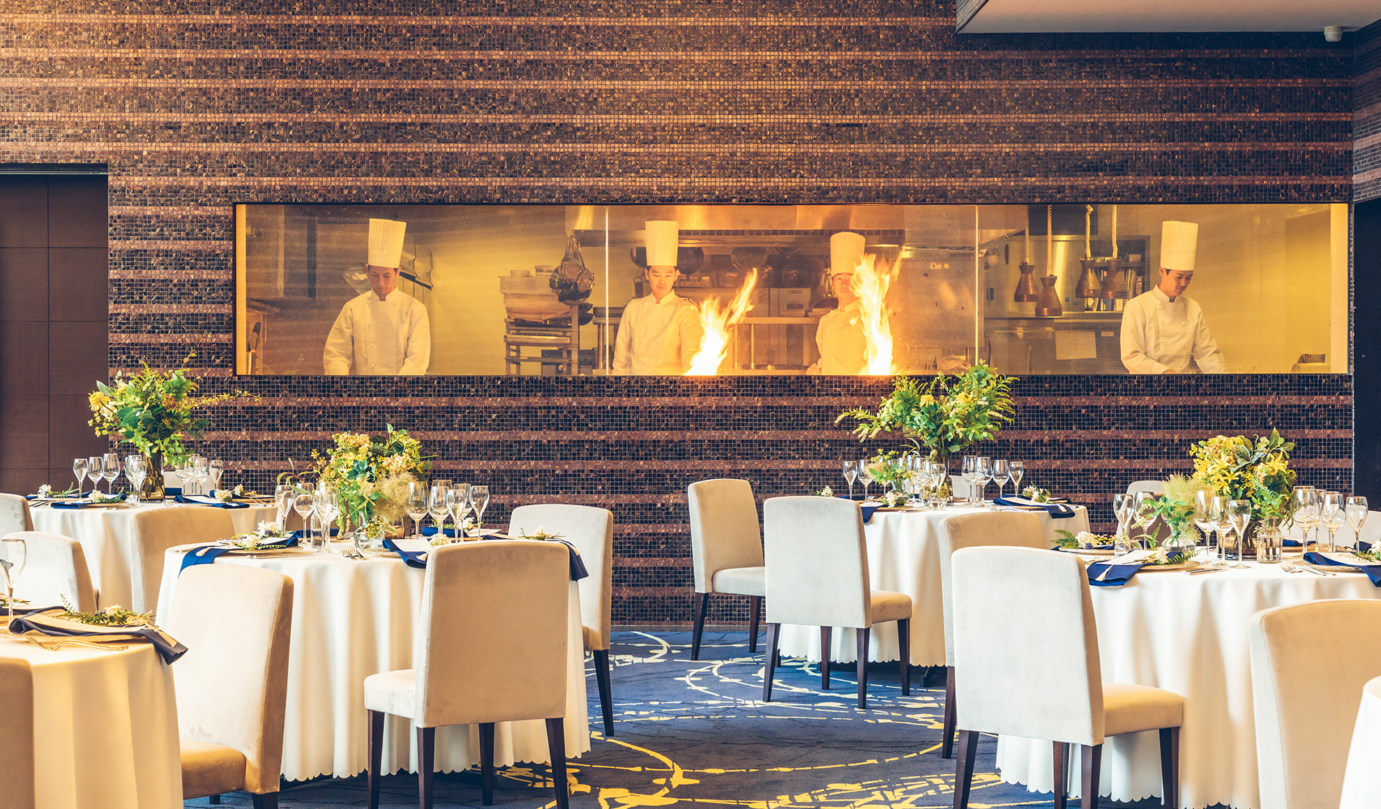 特大スクリーンやオープンキッチンなどゲストの記憶に残る演出も。